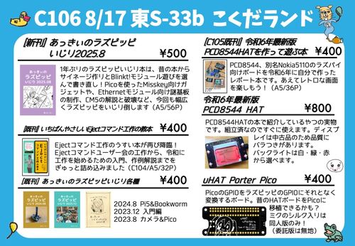 C106は、2日目 8/17(日) 東7ホール S-33b こくだランドでお待ちしています。新刊「あっきぃのラズピッピいじり 2025.8」はメロンブックスで予約受付中です。今日納品の発送をしたので、前回実績的にすぐ在庫として入庫されて、コミケの日以降わりとすぐに…