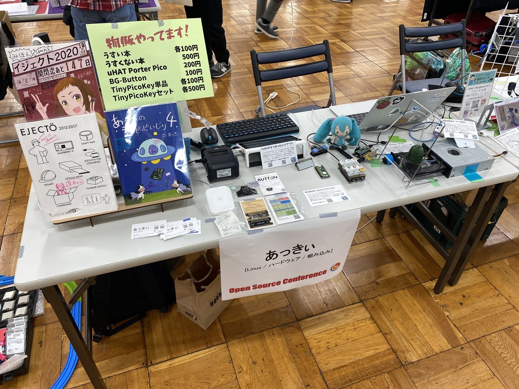 ラズパイ側。Picade、ICカードリーダー等久々の展示物もありつつ、OMMFに引き続き展示内容はかなりPico寄りに移っています。また、今週出たPico Wも電子ペーパーとしてなんとか並べました。結果としては、無線が混みすぎてきつかったかなというのはあります。