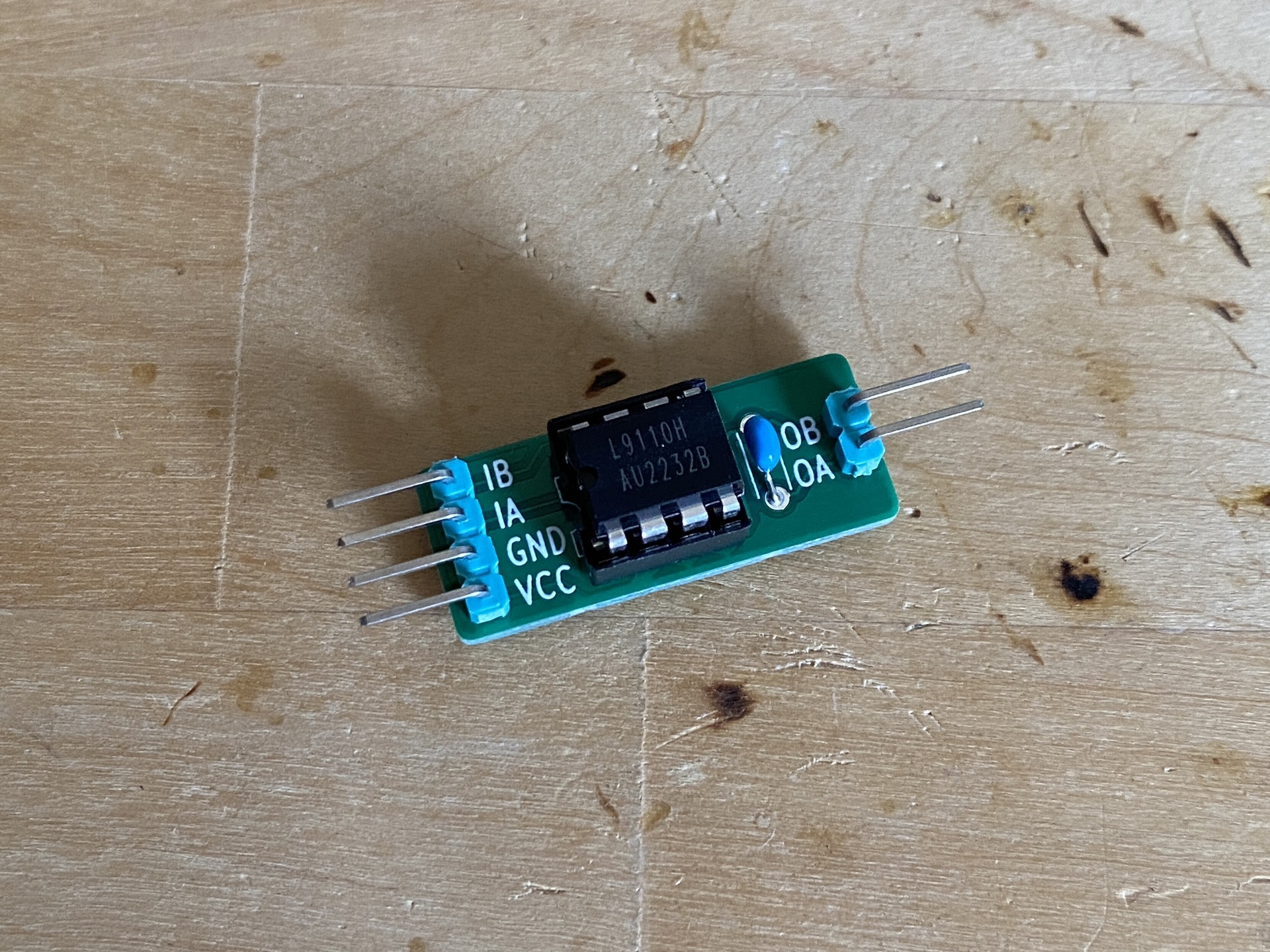 今回作成したモータードライバーの板はこちら。ダミー電池の中に貼り付けるので、細長目の形状です。
