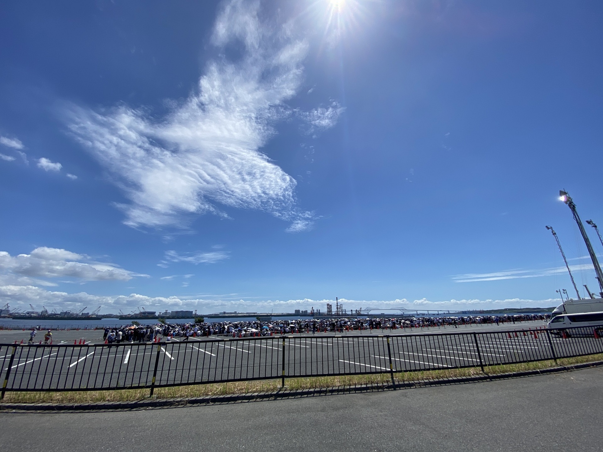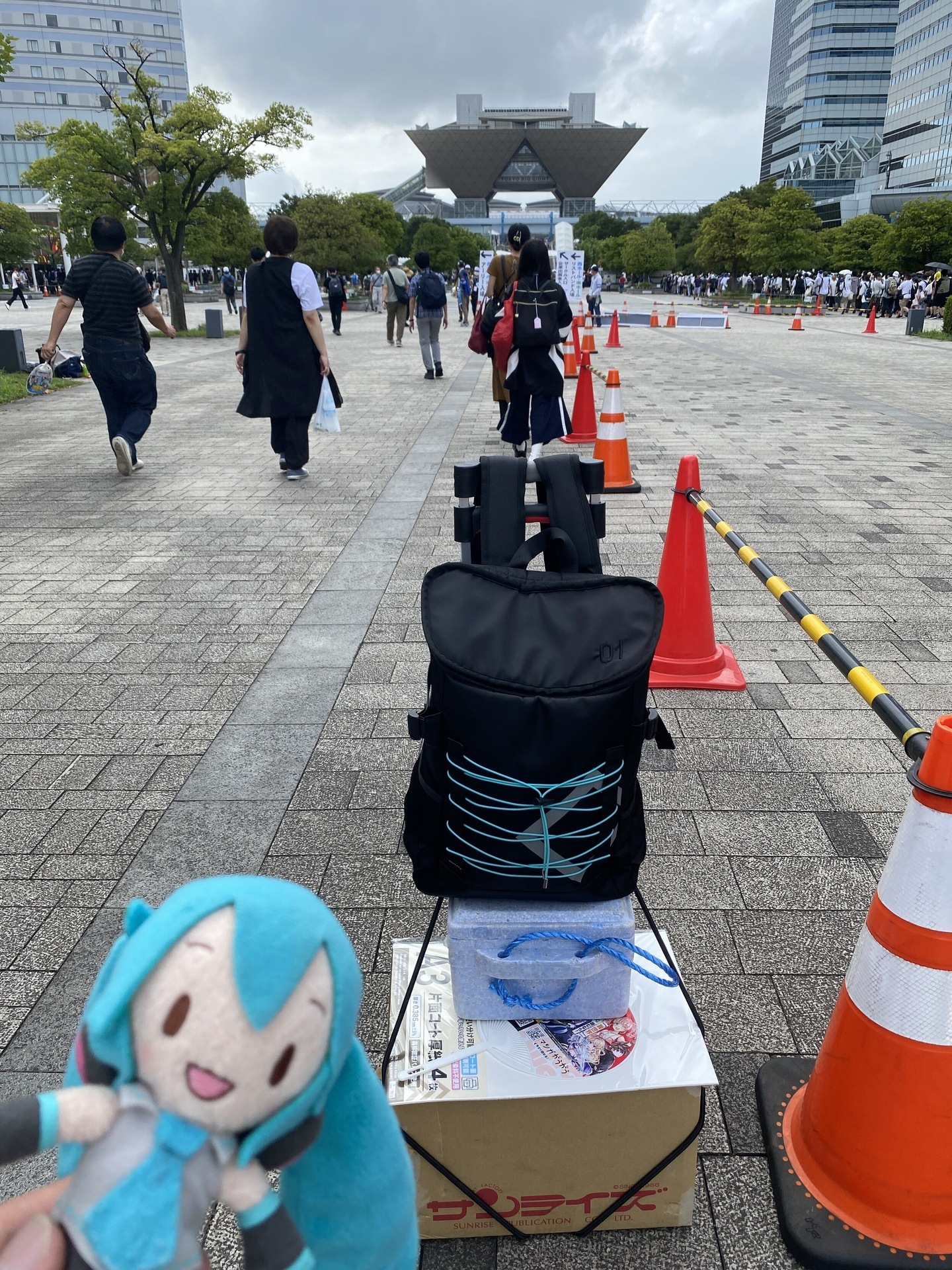 午前チケットで一般入場。10時すぎに国際展示場について30分かけて東駐車場に移動。そして1時間ほど待機した後、ぞろぞろとまた歩き始めて、12時ちょうどに館内に入りました。というわけで1時間半ほど外にいたわけですが、暑い……暑かったです。海風はやや涼しめでしたが、アスファルトがアッツアツで、しゃがんでる途中でうっかり手をつこうものならジュッとなりそうなレベルでした。移動が開始すると、1ブロック1〜2人は体調を崩して取り残され、救護が呼ばれているようでした。過酷。