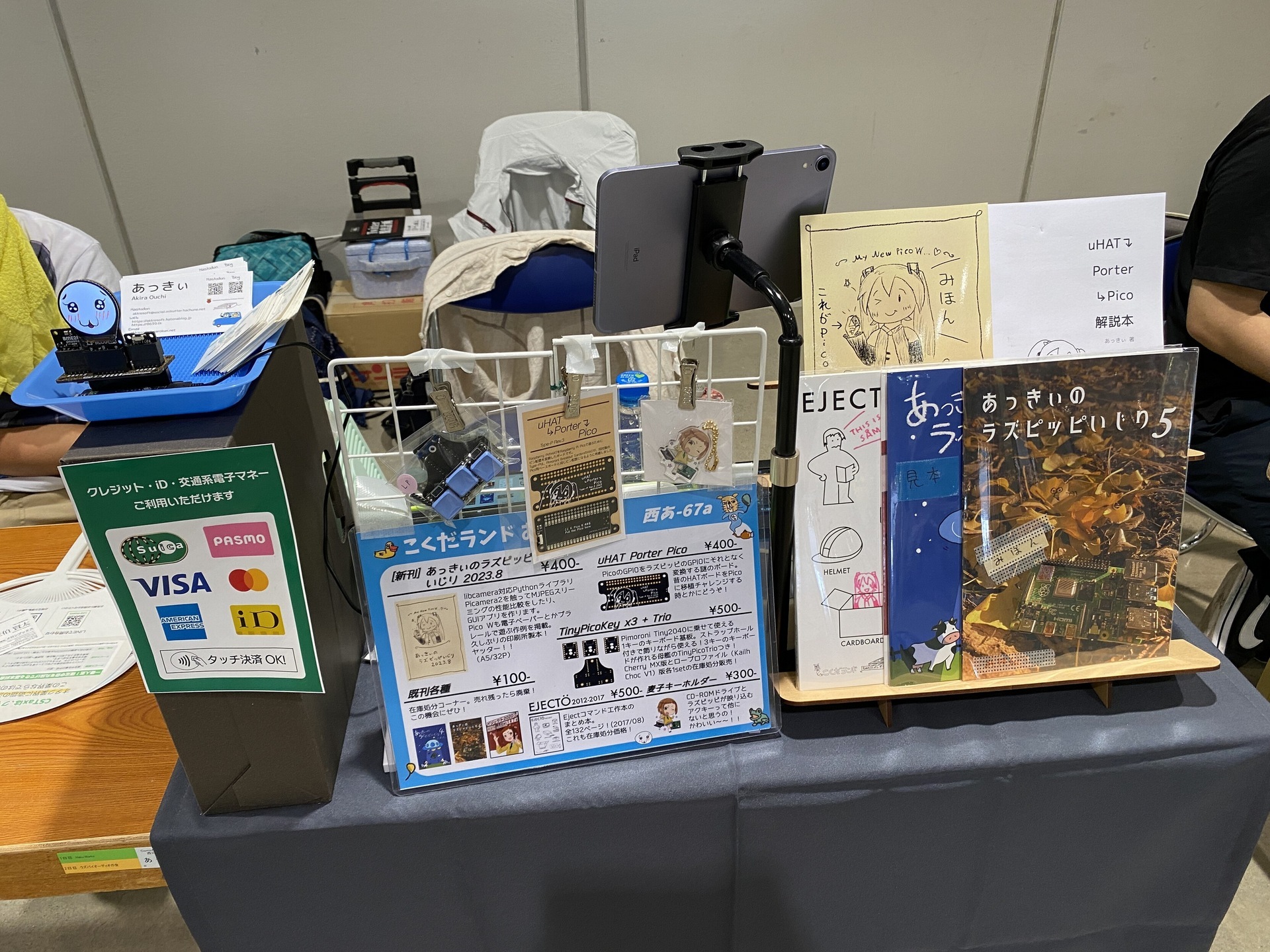 今回の机。基本的なレイアウトは前回を踏襲しています。既刊は今回が最後のつもりで出しましたが、ラズピッピいじり5が完売できた以外は無事売れ残ったので、残りは廃棄して次からは売り物を減らしてスッキリさせられる予定です。新刊ははじめてオンデマンド印刷を使いましたが、全然問題なくて、次からこれで良いやとなりました。