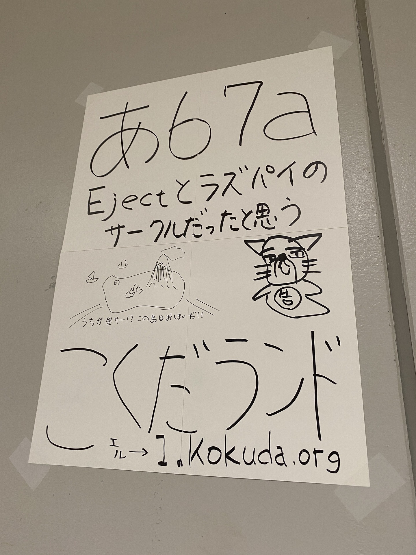 そして今回は、今までコミケサークル参加してきて始めて、壁に配置されました。言うまでもなくジャンル配置の都合で壁が割り当てられただけで、別に頒布数等でそうなったわけではないのですが、それでもせっかくの壁なのでと、ダイソーでA3の紙4枚入りを買ってきて、朝の時間に下書きもなく一発書きでポスターのようならくがきを張り出し。