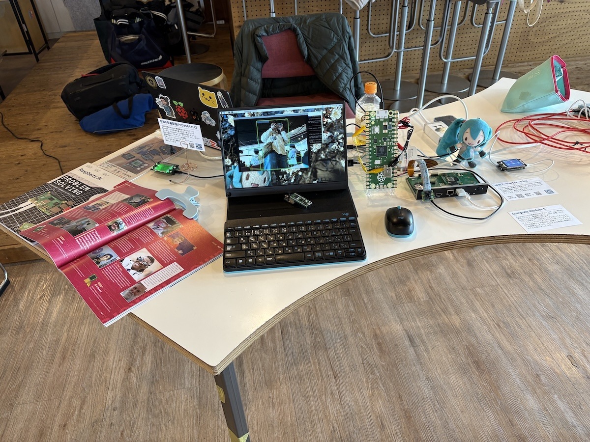 CM5とAIカメラの組み合わせ。これ自体は春のOSC東京でもやりましたが、今回は上蓋を外して持っていきました。中身が見れることを優先して、発熱は気にしない方向で。先述の通り無線が破壊されたCM5なので、USB無線LANドングルが活躍しました。