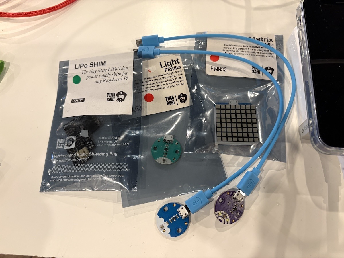 そして、みんなだいすき床に雑に置かれたジャンク箱。今回もつい色々買ってしまいました。メインはPimoroniのFlotillaシリーズのモジュールたち。MicroUSBコネクターを利用したI2C接続のハズなので、配線さえどうにかなれば普通に使えるやつですが、Flotillaシリーズがディスコン済みで情報もほぼないため、地味にハイレベルな状態です。でも50円だったので、なんとなく買うよね。LiPo SHIMは100円でしたが、いつか使うかもしれないので確保です。プラレールとかまたやるかもしれないしね(???)